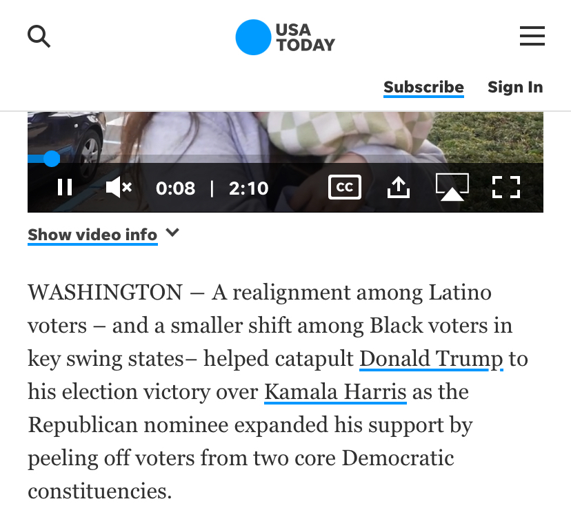 How does this make any sense when USA Today reports “a realignment among Latino voters – and a smaller shift among black voters in key swing states – helped catapult Donald Trump to his presidential victory over Kamala Harris.” Some Hitler.